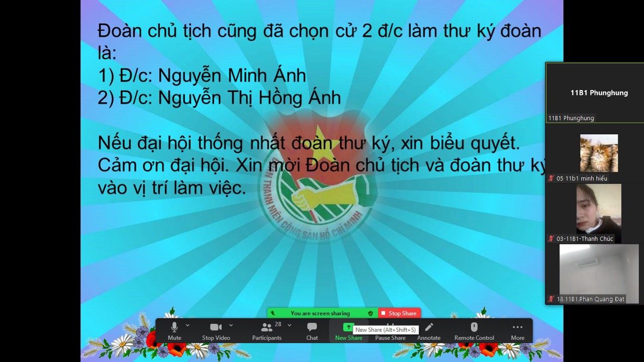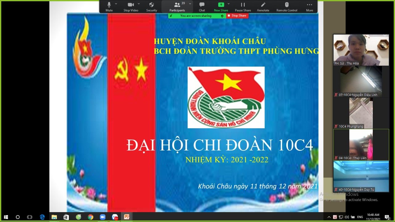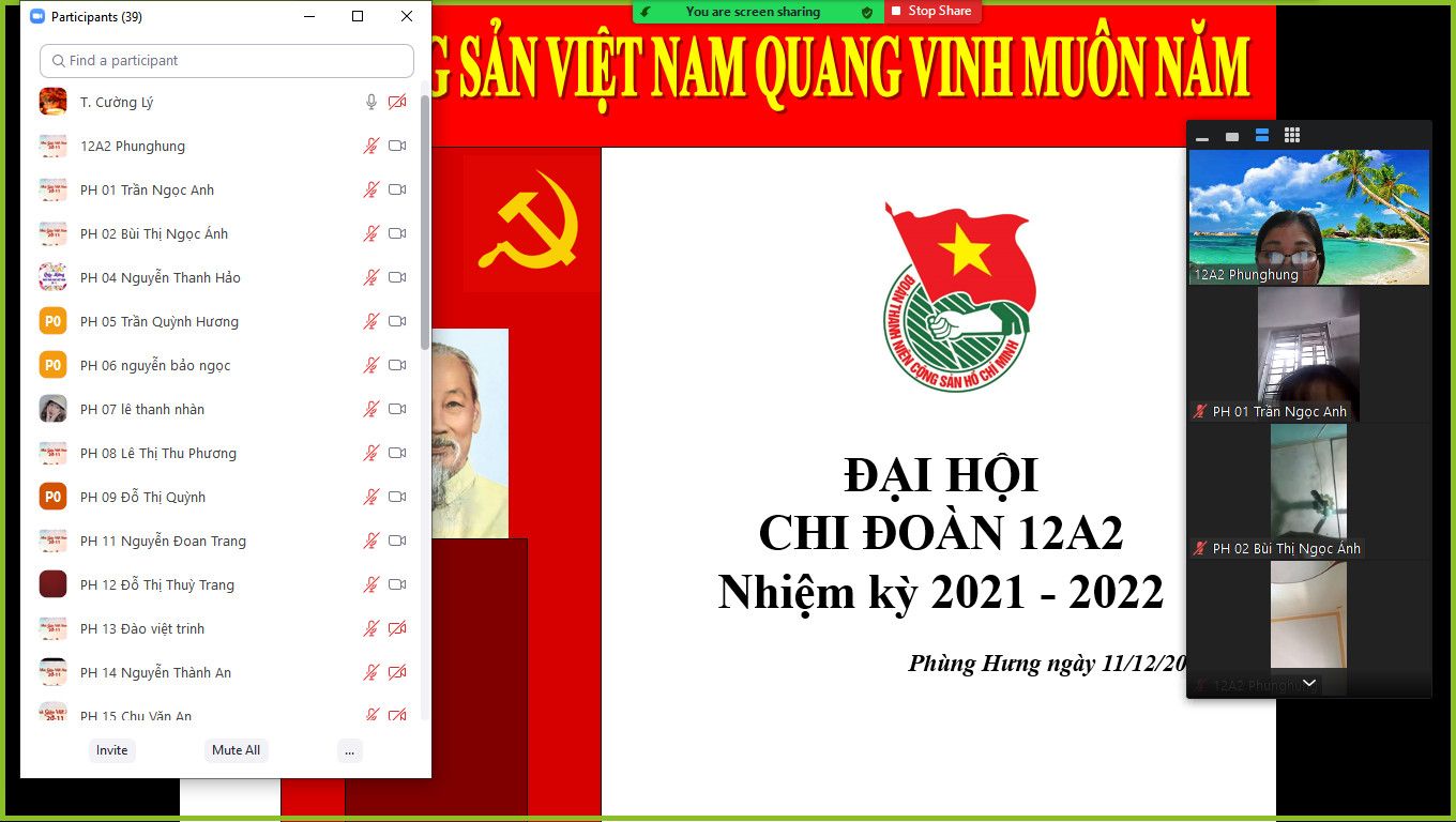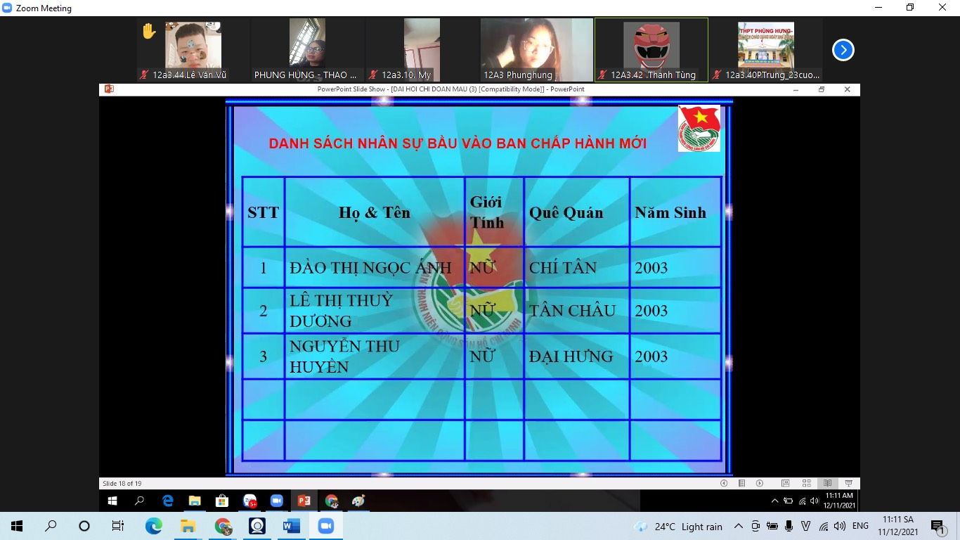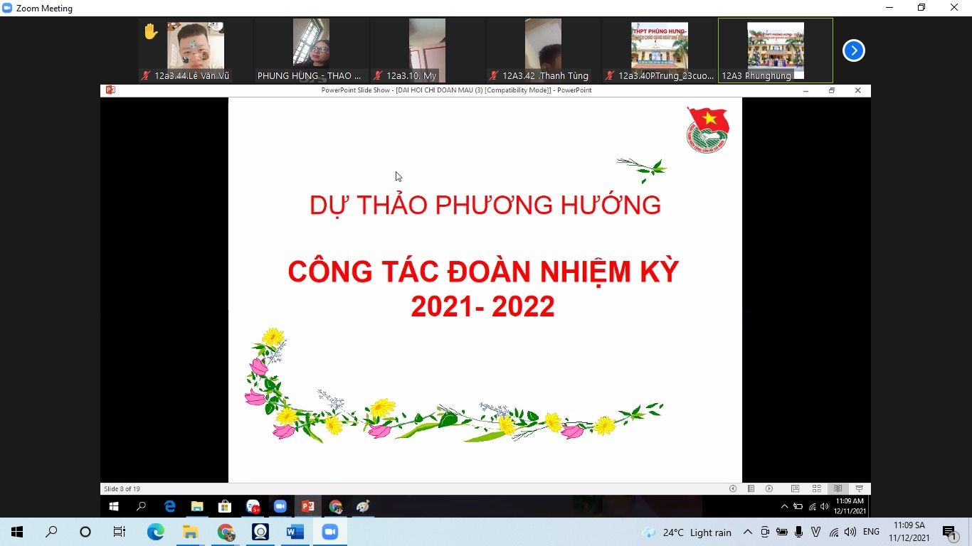 Ngày 11/12/2021 Đoàn trường THPT Phùng Hưng tiến hành Đại hội chi đoàn các lớp vào tiết 5, được tổ chức tại phòng Zoom của lớp dưới sự giám sát của GVCN và Ban thường vụ Đoàn trường dự.