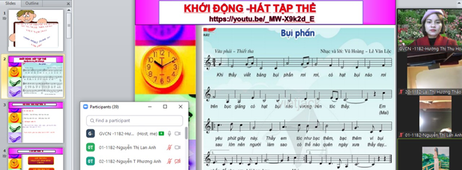 Mở đầu buổi sinh hoạt là phần khởi động với mục hát tập thể bài “ Bụi phấn” tạo không khí sôi nổi cho tiết học.