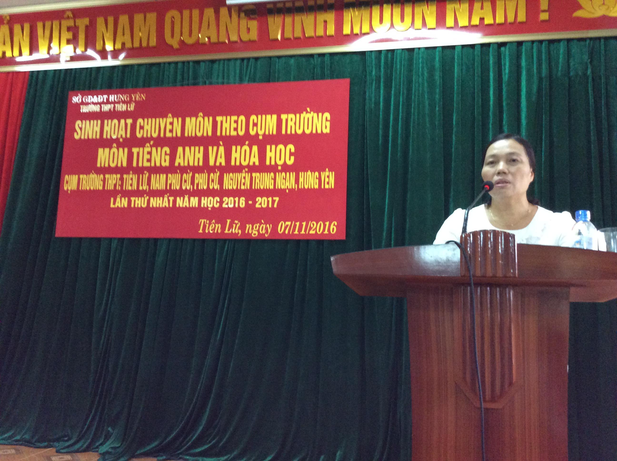 Cô Phạm Thị Bích Ngọc – Phó Hiệu trưởng trường THPT Tiên Lữ báo cáo sơ kết sinh hoạt chuyên môn theo cụm trường lần thứ nhất năm học 2016-2017