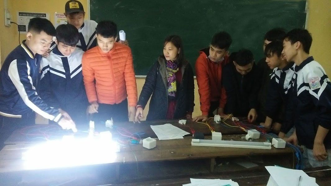 Các em lớp Điện dân dụng được thầy cô hướng dẫn thực hành