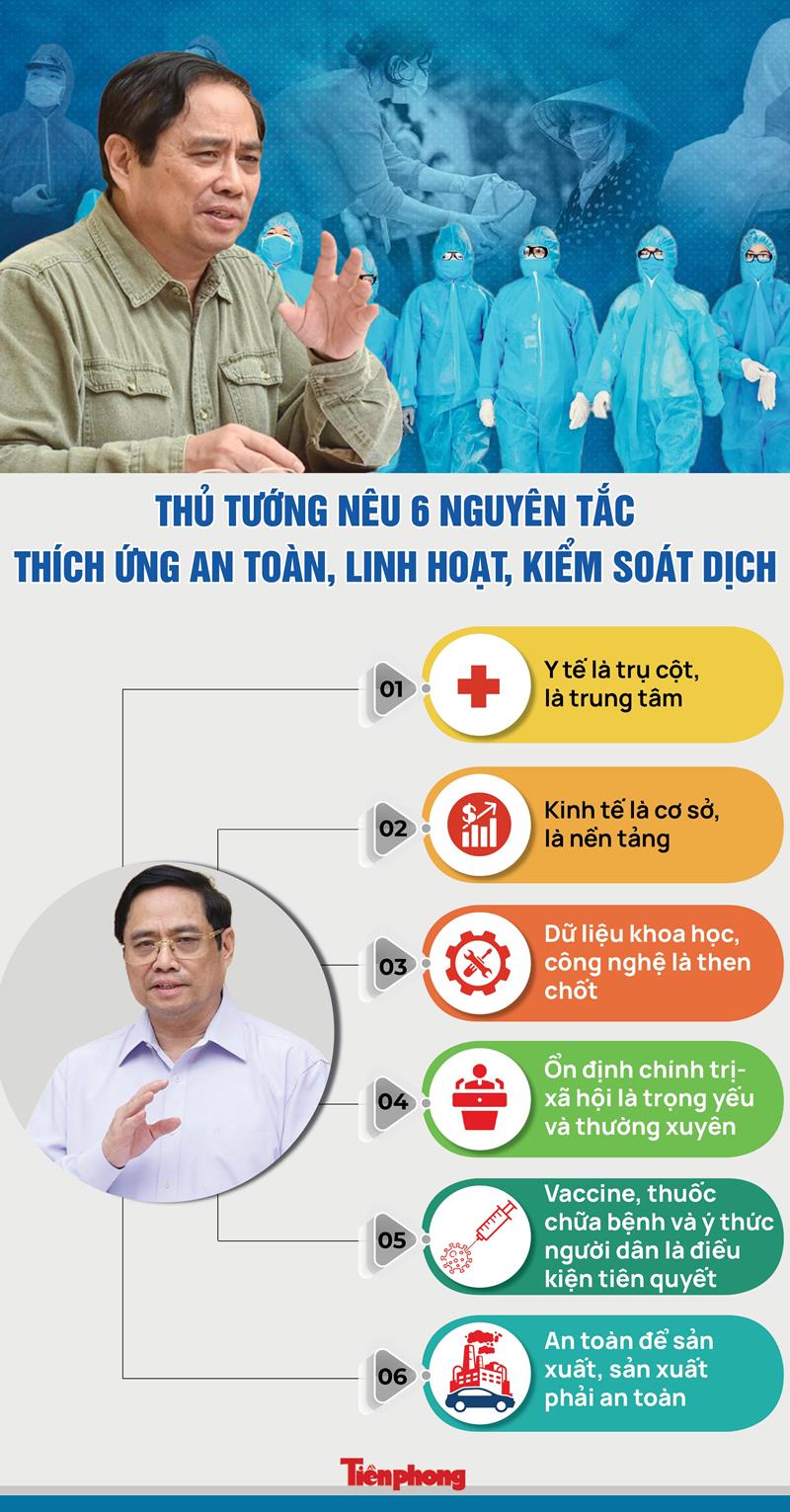 Thủ tướng Chính phủ Phạm Minh Chính, Trưởng Ban Chỉ đạo Quốc gia phòng, chống dịch COVID-19 nhấn mạnh 6 nguyên tắc phải quán triệt để xây dựng hướng dẫn thích ứng an toàn, linh hoạt, kiểm soát có hiệu quả dịch bệnh COVID-19.